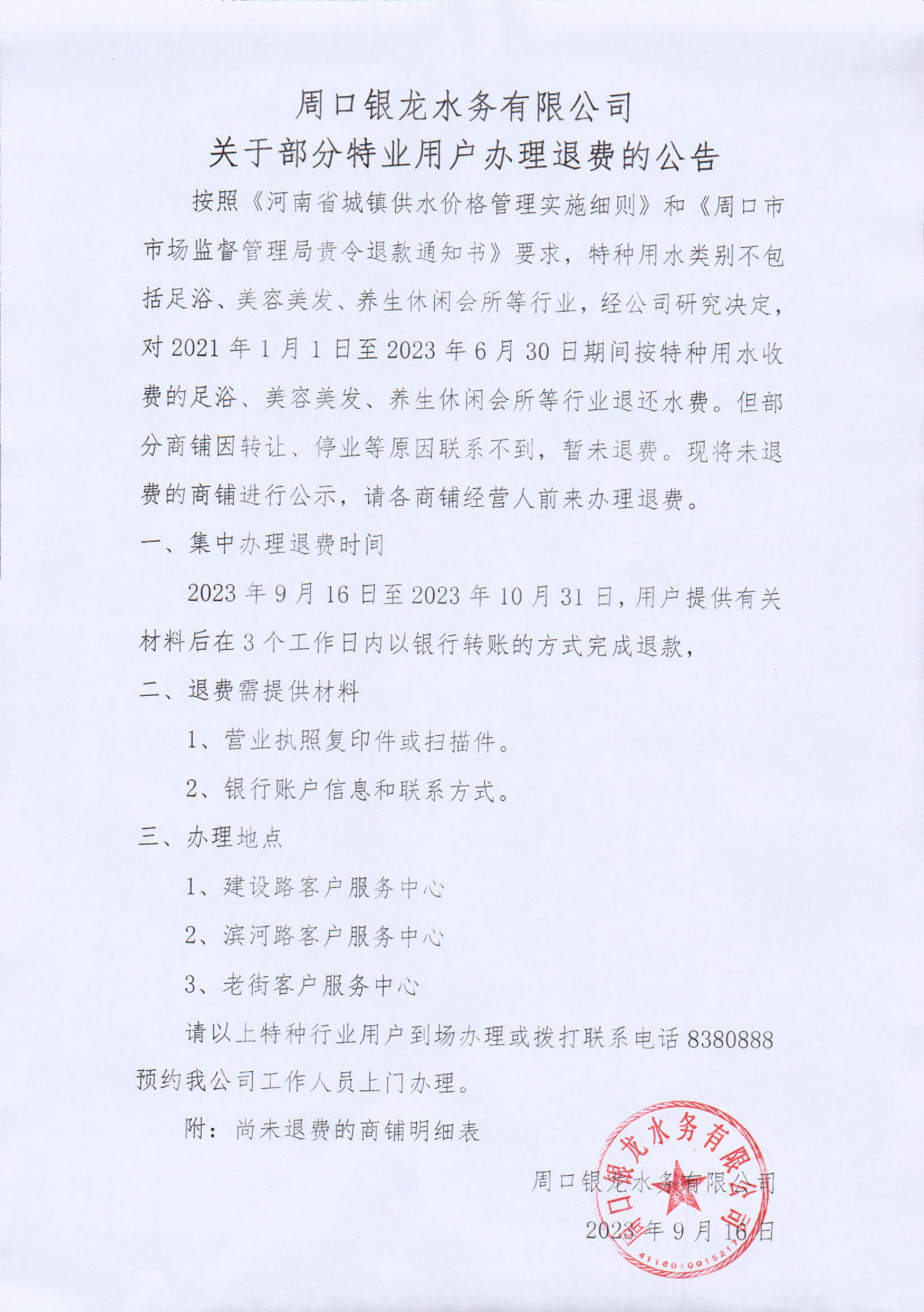 周口银龙水务无限公司对于局部特业用户操持退费的告诉布告